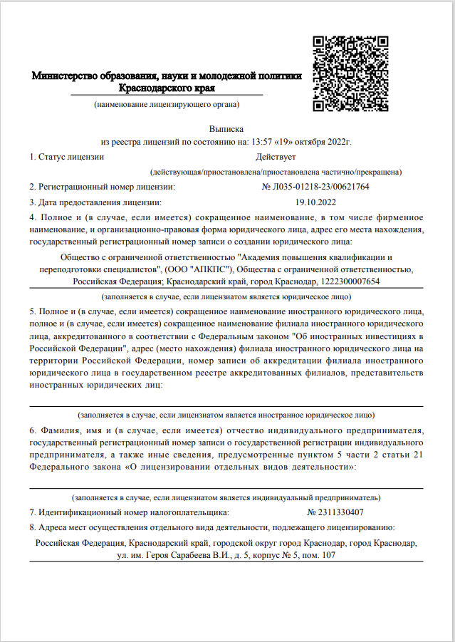 Уважаемые пользователи, данные о новой лицензии ООО "Академия повышения квалификации и переподготовки специалистов" доступна на сайте Федеральной службы по надзору в сфере образования и науки (Рособрнадзоре)