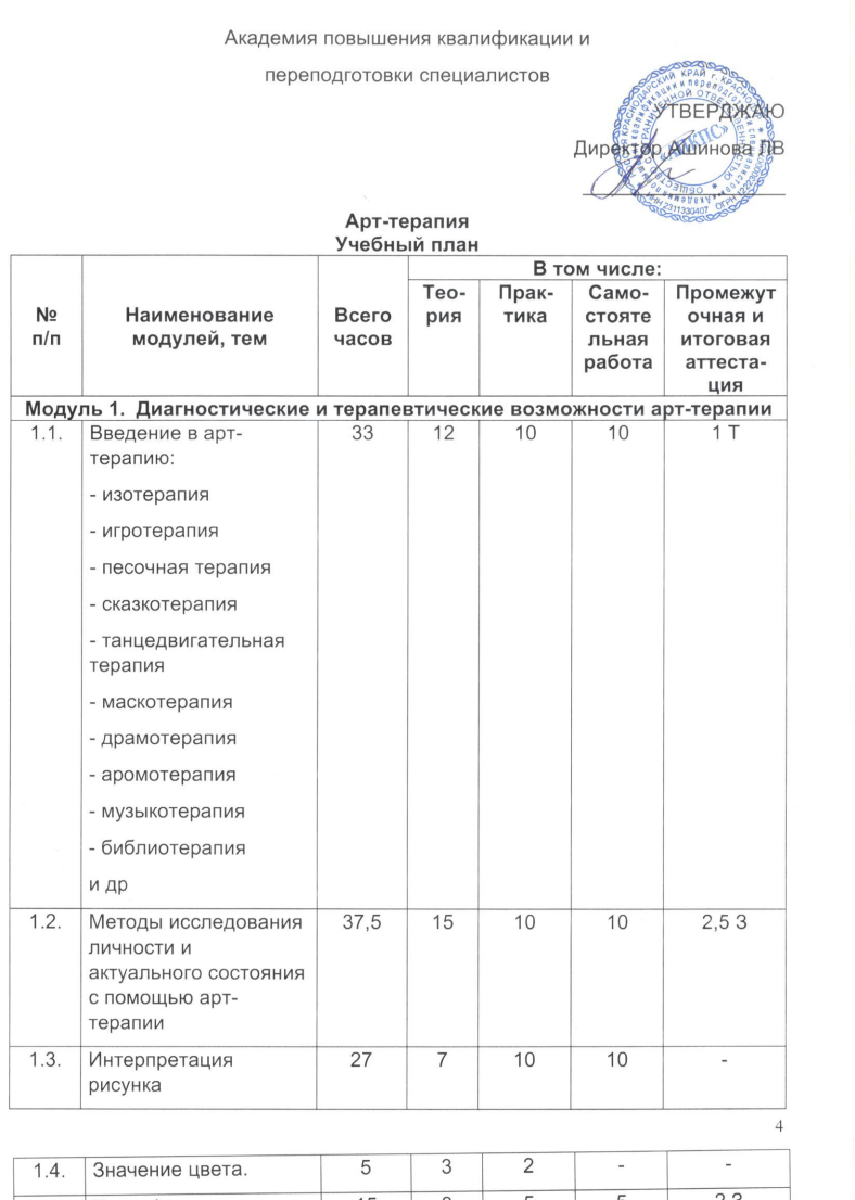 1 Модуль. Диагностические и терапевтические возможности арт-терапии 1.1. Введение в арт-терапию - изотерапия - игровая терапия - песочная терапия - сказкотерапия - танцедвигательная терапия - маскотерапия - драмотерапия - аромотерапия - музыкотерапия - библиотерапия и др 1.2. Методы исследования личности и актуального состояния с помощью арт-терапии - графические методы диагностики 1.3. Способы взаимодействия терапевта с пациентом.