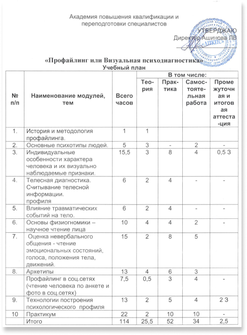 Курс полезен для психологов, руководителей, эйчаров, продажников, для всех, кто хочет научиться читать мысли, предугадывать поведение, эффективно общаться с людьми, а так же, кому важно с первых секунд общения понимать полный профиль человека, его склонности и интересы. В результате обучения вы получите инструмент быстрой визуальной психодиагностики, целью которой является эффективный контакт и прогнозирование поведения человека. По окончании выдается сертификат или удостоверение о повышении квалификации с внесением данных в ФИС ФРДО